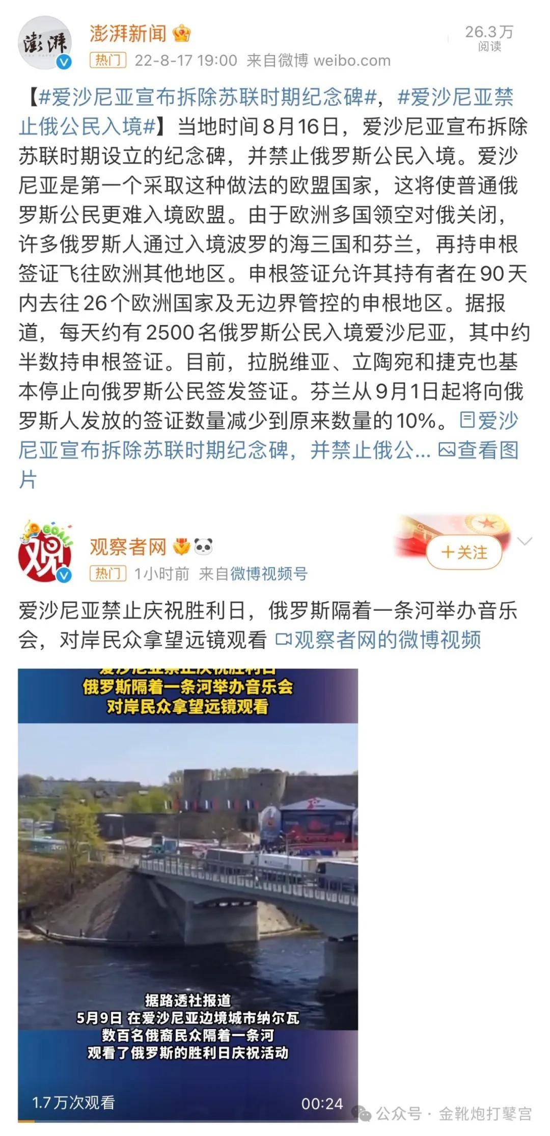 除此之外,2023年5月,罗马尼亚总统丘卡也决定将该国胜利日的纪念活动从5月9日提前到5月8日;拉脱维亚议会也通过了一项法案,禁止在5月9日进行除欧洲日之外的任何纪念和庆祝活动;爱沙尼亚同样早就禁止在5月9日纪念卫国战争……更不用提,还有波兰这样的大肆拆除红军雕像的国家存在。