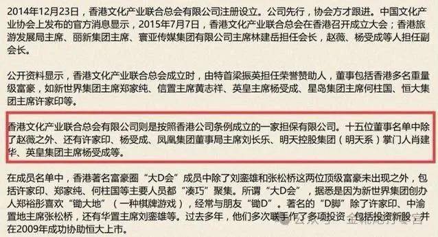 根据公开资料,小燕子与明天系的大BOSS曾在香港文化产业联合总会有限公司担任董事——而这家「香港文化产业联合总会」的董事名单可谓星光熠熠,大佬云集,小燕子不过是以“著名导演”的身份担任副会长。