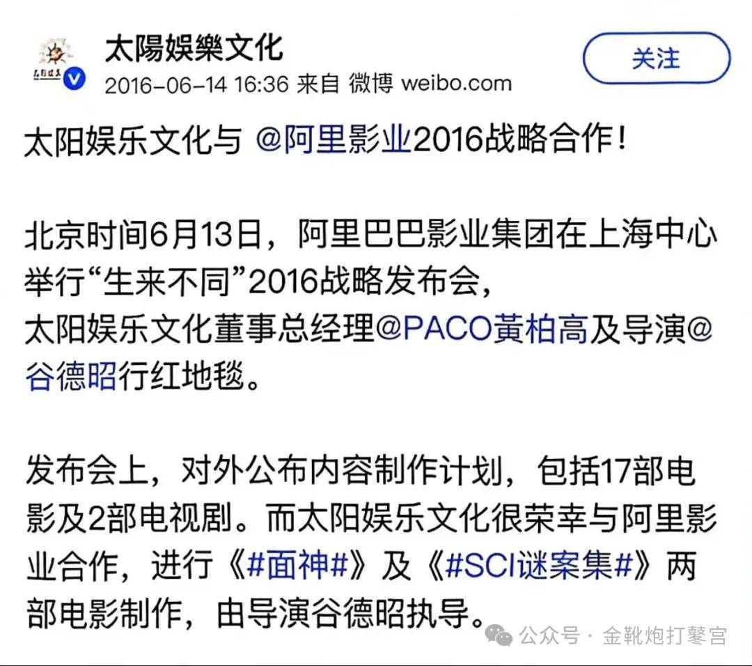 它本身是阿里系与明天系、财新传媒共同苟合打造的文化业巨头——2014年3月11日,阿里耗资62.44亿港币买下港股「文化中国」(HK.1060)60%的股权,随后更名为「阿里影业」。