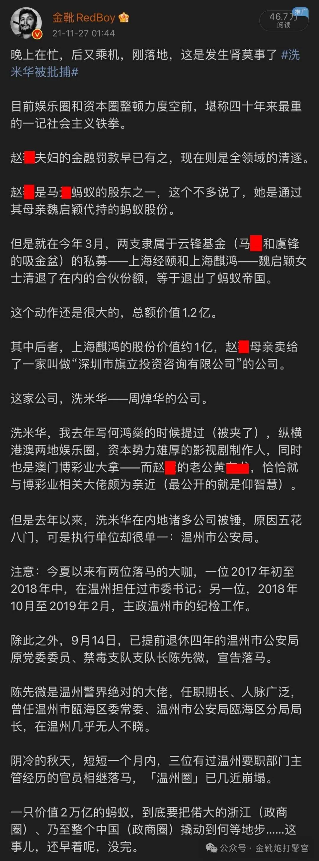 就在接收了小燕子的蚂蚁资本不到半年后,洗米华被逮捕……
