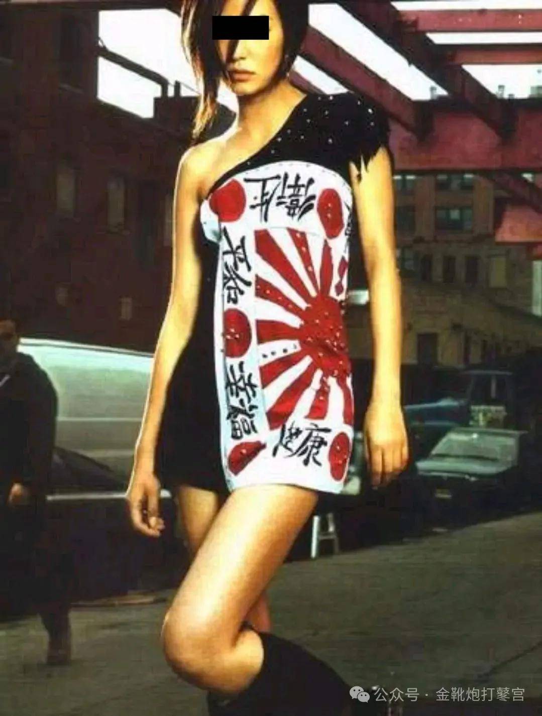 早在2001年夏天,小燕子在美国曼哈顿为杂志《时装》拍摄宣传照时,竟然公然穿上日本旭日旗这种法西斯秽物,大摇大摆,搔首弄姿,全然忘却家仇国恨和国内民众的情绪观感。